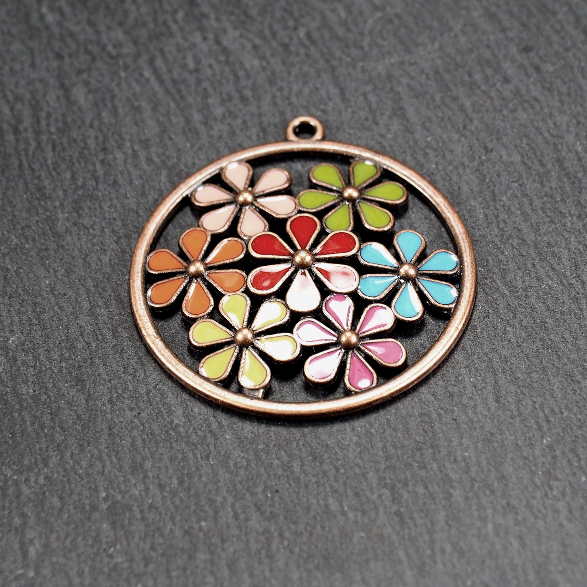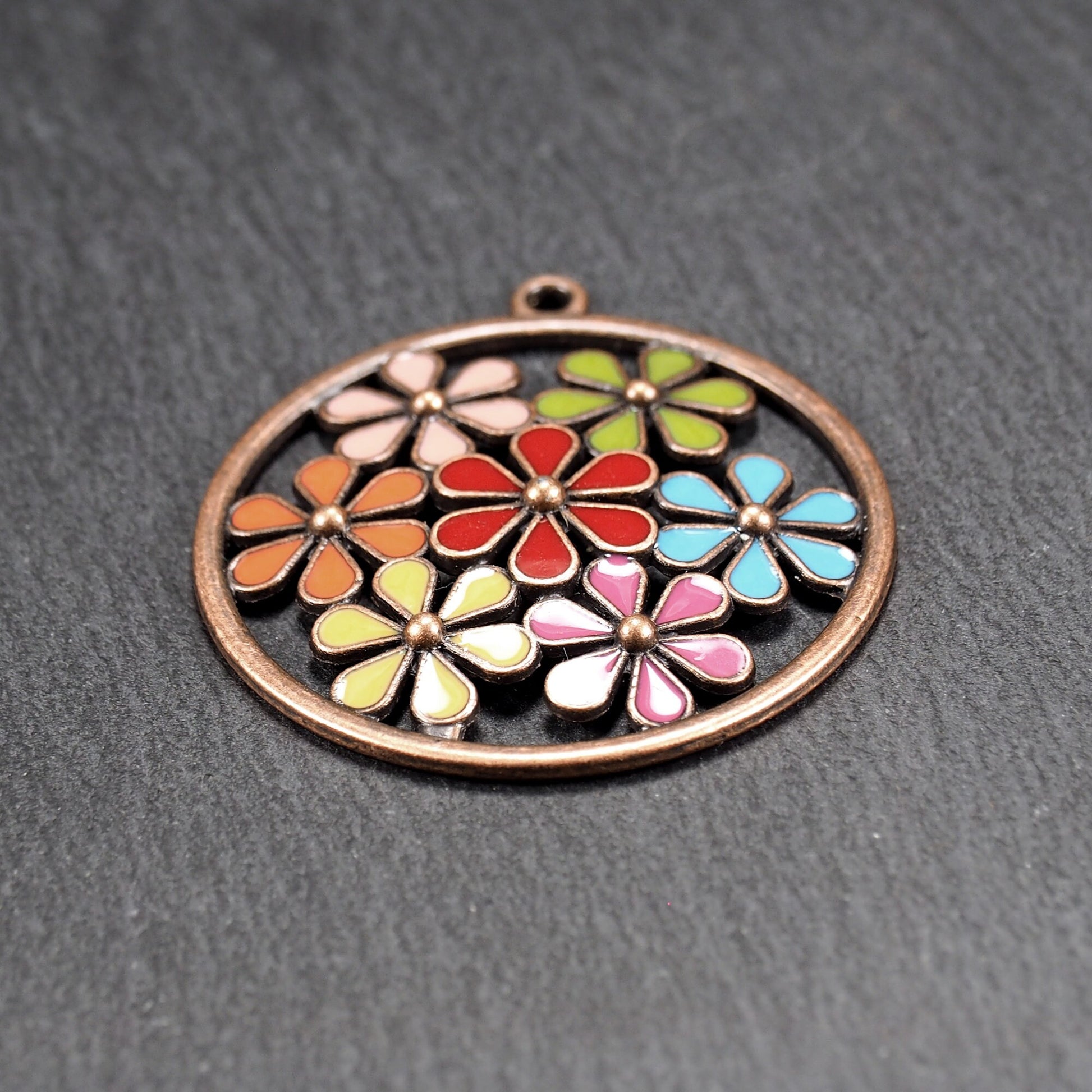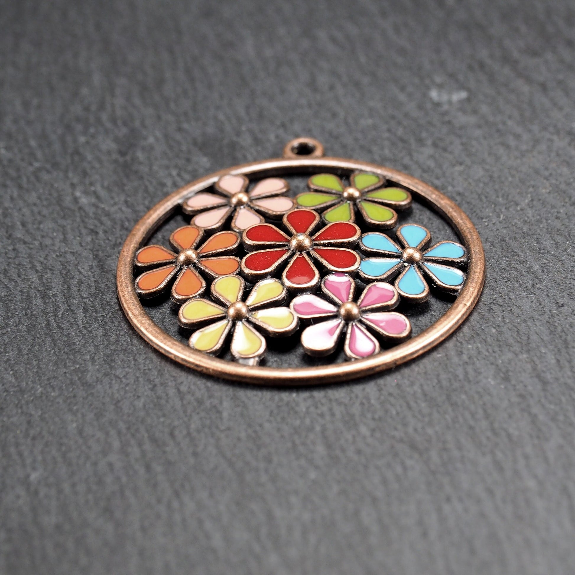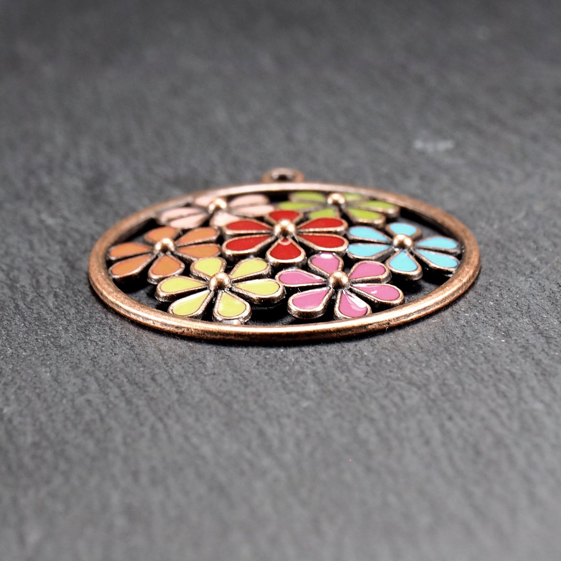 Runder Anhänger im Boho-Hippie-Stil aus antik kupferfarbener Zinklegierung, verziert mit bunten Emaille-Blüten in den Farben Rosa, Lindgrün, Bordeauxrot, Türkis, Zartgelb und Orange. Der farbenfrohe Blumenmix verleiht dem Anhänger eine charmante und lebendige Ausstrahlung, ideal für Halsketten oder als zentrales Element in kreativen Schmuckstücken. Ein Muss für Liebhaber des Boho-Hippie-Looks, die eine subtile, aber dennoch ausdrucksstarke Note schätzen.