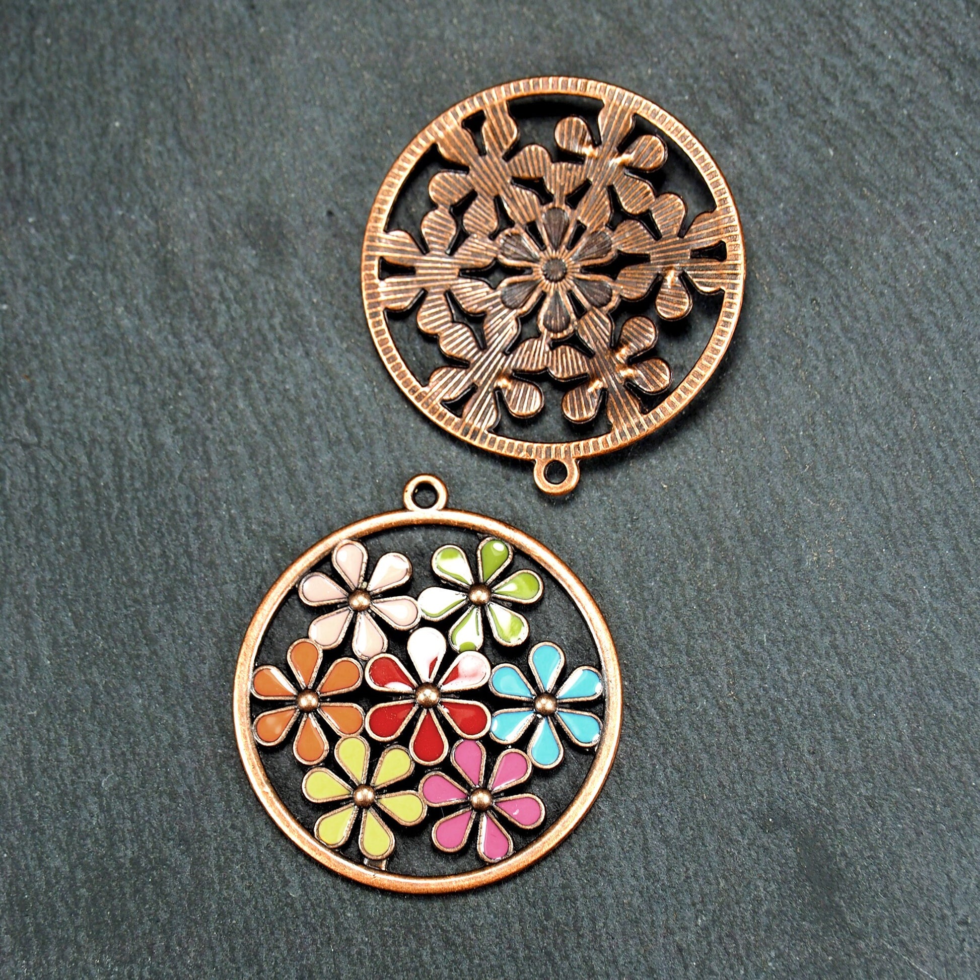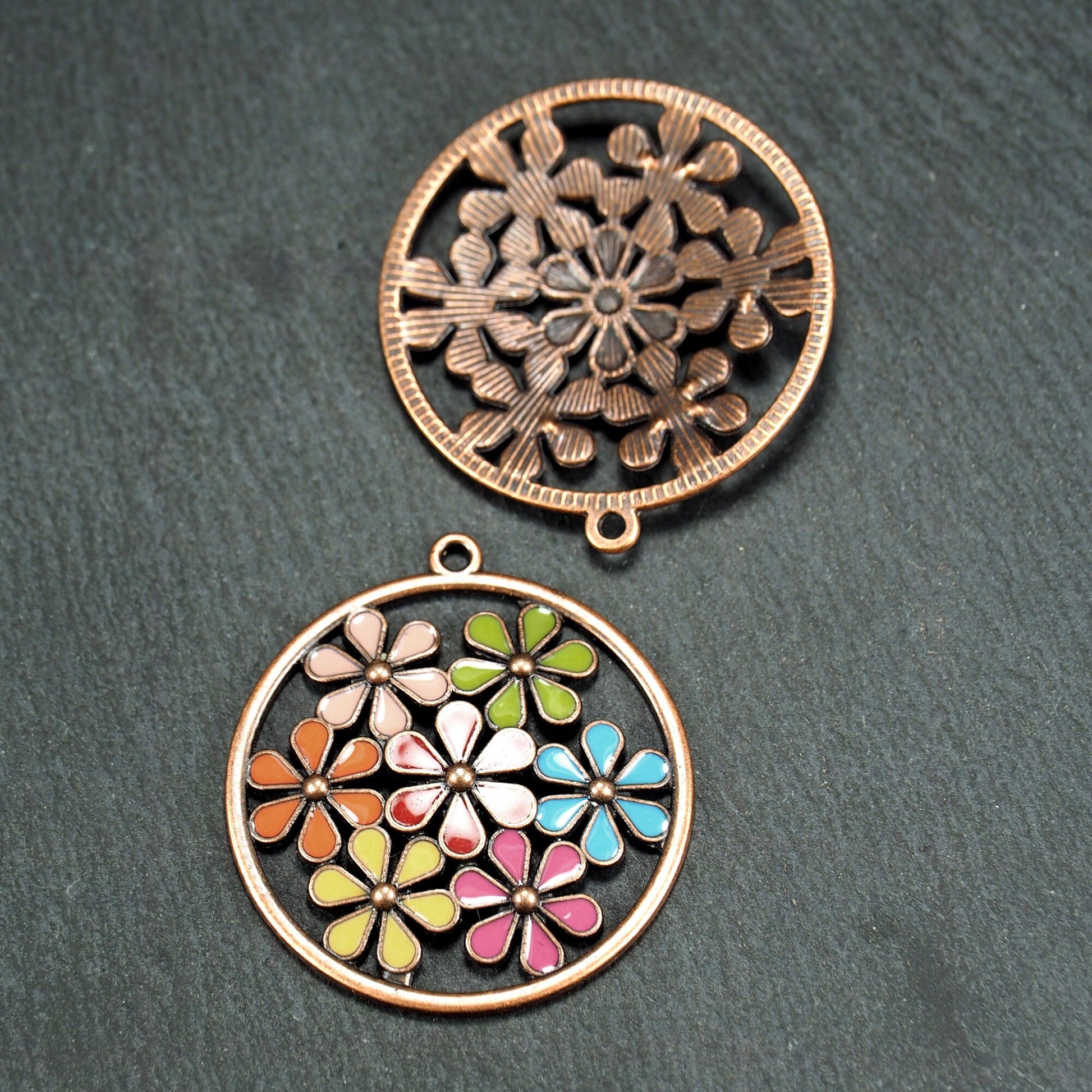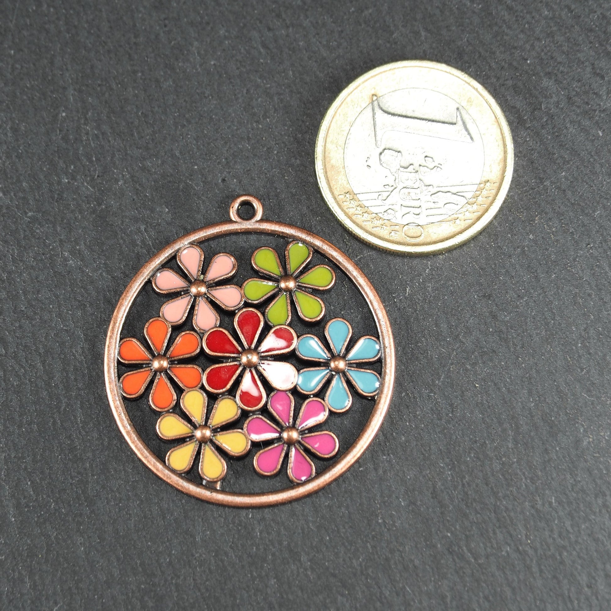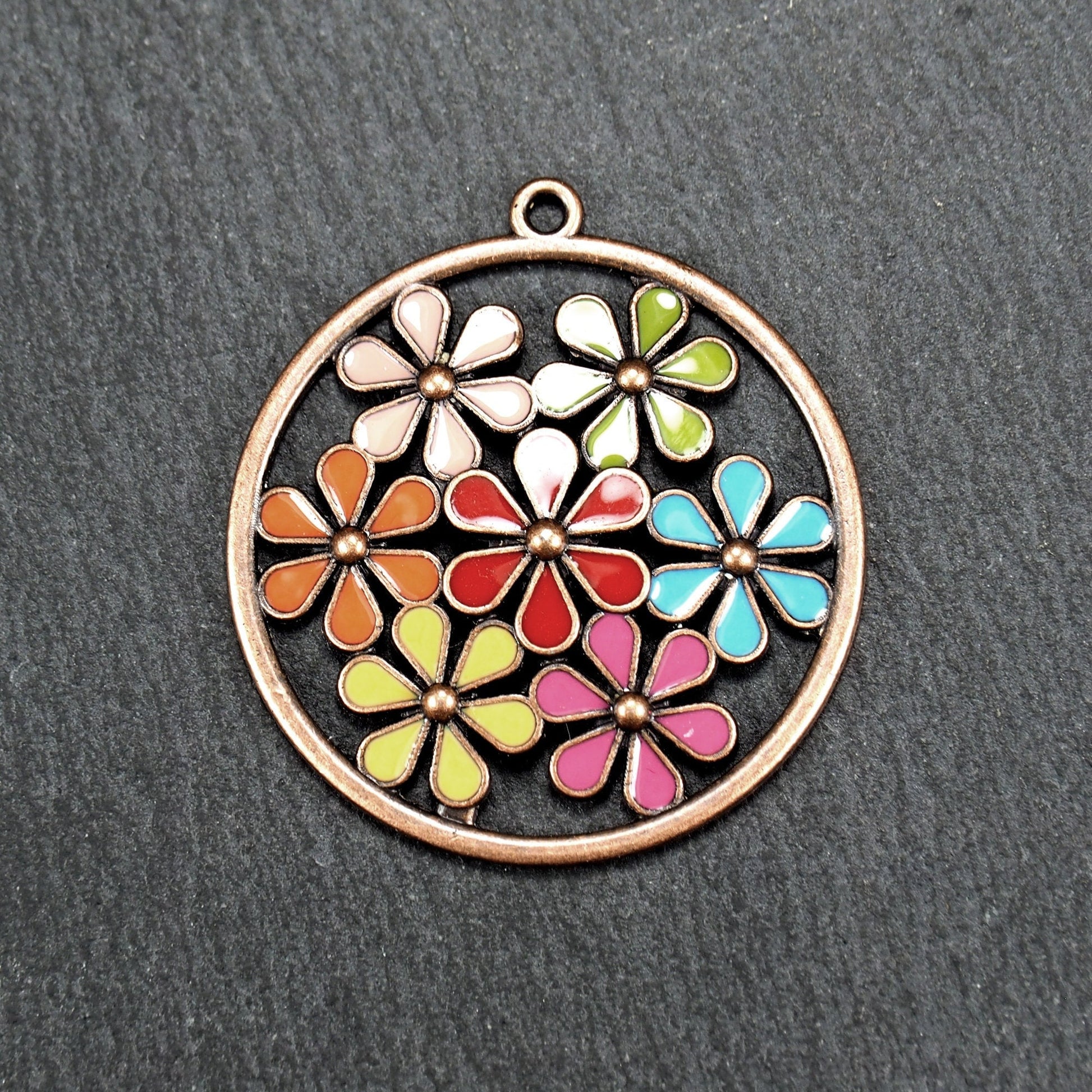 Runder Anhänger im Boho-Hippie-Stil aus antik kupferfarbener Zinklegierung, verziert mit bunten Emaille-Blüten in den Farben Rosa, Lindgrün, Bordeauxrot, Türkis, Zartgelb und Orange. Der farbenfrohe Blumenmix verleiht dem Anhänger eine charmante und lebendige Ausstrahlung, ideal für Halsketten oder als zentrales Element in kreativen Schmuckstücken. Ein Muss für Liebhaber des Boho-Hippie-Looks, die eine subtile, aber dennoch ausdrucksstarke Note schätzen.